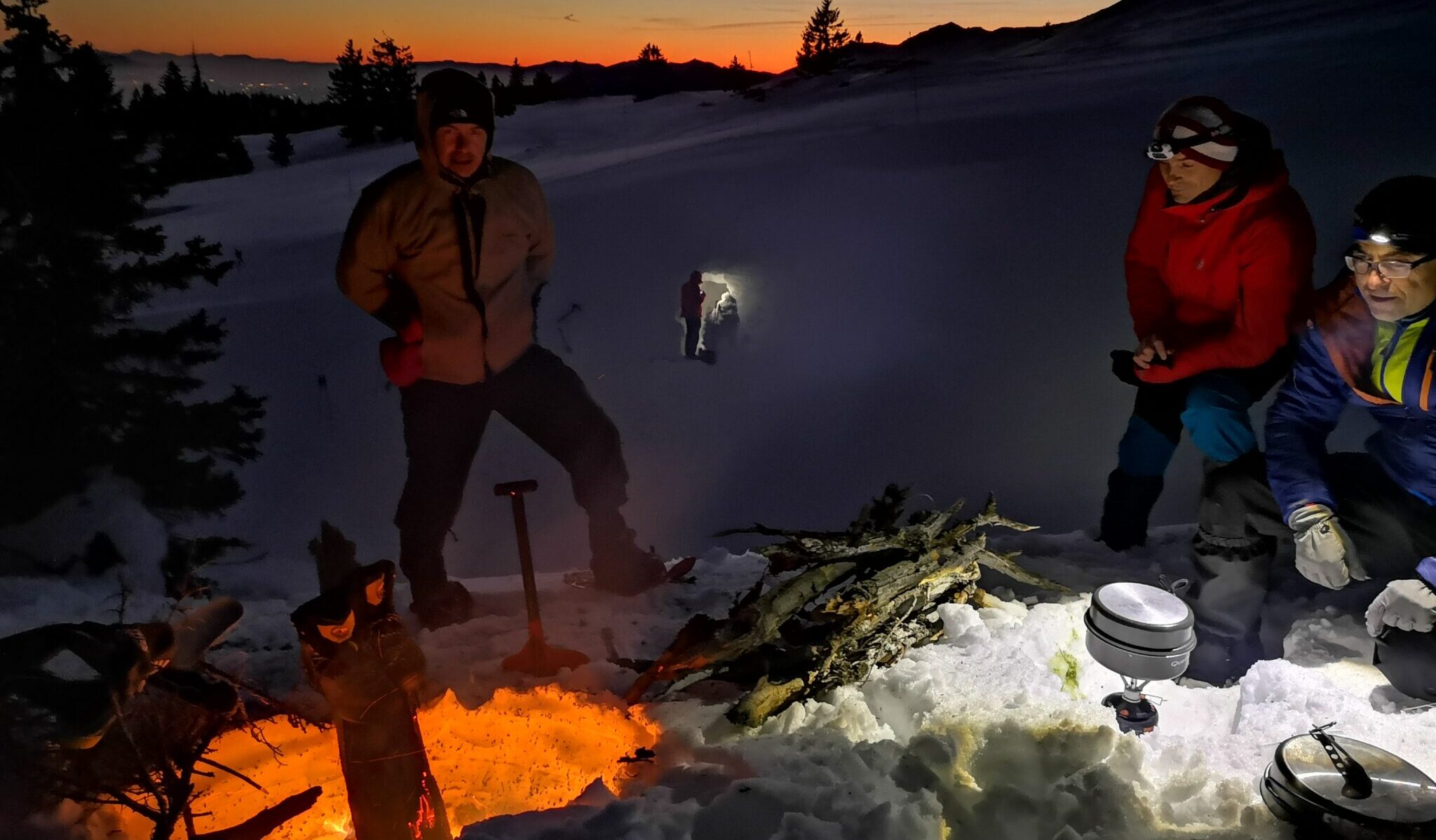- Recherche de l’emplacement pour la nuit et construction des abris à neige (tranchée couverte, congère creusée, quinzee…)